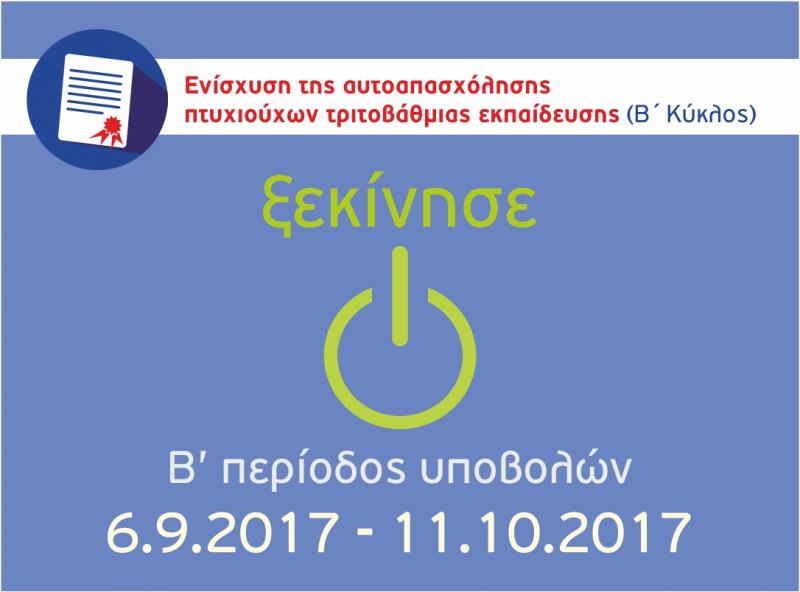 Ξεκίνησε σήμερα η 2η περίοδος υποβολών για τη δράση των Πτυχιούχων Τριτοβάθμιας Εκπαίδευσης - Β΄Κύκλος του ΕΠΑνΕΚ, η οποία θα διαρκέσει μέχρι και τις 11.10.2017.