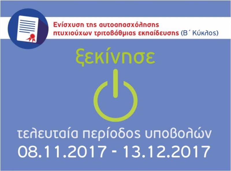 Ξεκίνησε η 3η περίοδος υποβολών για τη δράση του ΕΠΑνΕΚ «Ενίσχυση της αυτοαπασχόλησης πτυχιούχων τριτοβάθμιας εκπαίδευσης» (Β' Κύκλος).