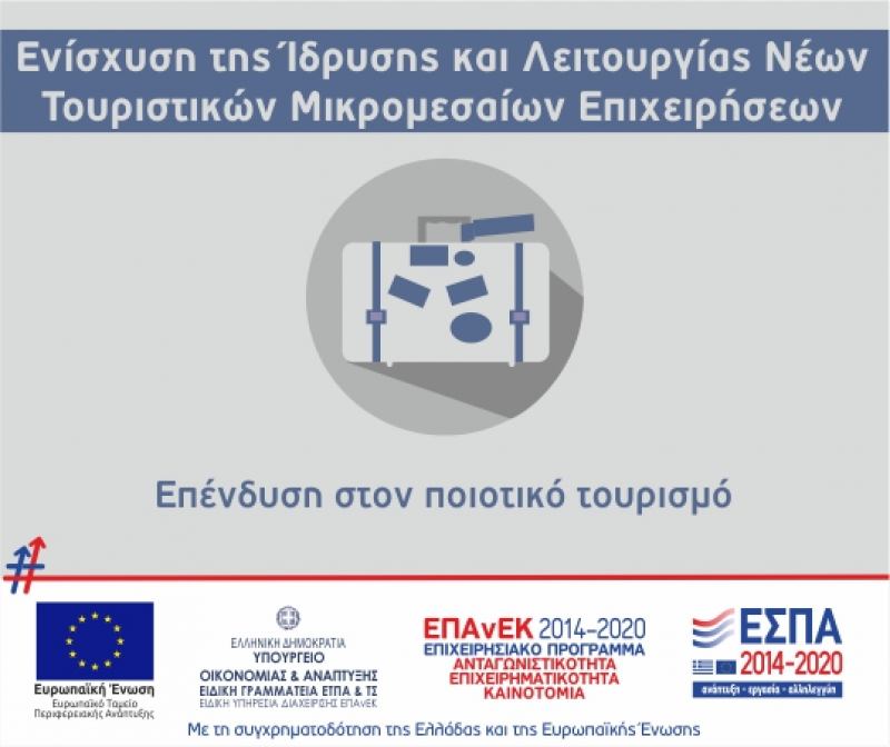 Ενημερώνουμε τους ενδιαφερόμενους για την δράση «Ενίσχυση της Ίδρυσης και Λειτουργίας Νέων Τουριστικών Μικρομεσαίων Επιχειρήσεων», ότι οι εργασίες συντήρησης στο Πληροφοριακό Σύστημα Κρατικών Ενισχύσεων (ΠΣΚΕ),www.ependyseis.gr έχουν ολοκληρωθεί και η λειτουργία υποβολής των προτάσεων έχει αποκατασταθεί.