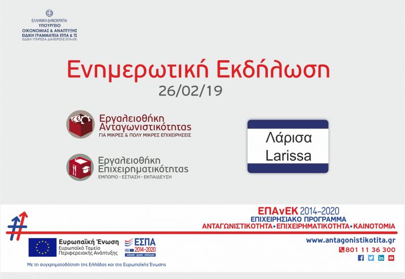 Στις 26/02/19 και ώρα 19:00 θα πραγματοποιηθεί στη Λάρισα στο Επιμελητήριο Λάρισας (Παπακυριαζή 44), ενημερωτική εκδήλωση για τις Δράσεις του ΕΠΑνΕΚ «Εργαλειοθήκη Ανταγωνιστικότητας για Μικρές και Πολύ Μικρές Επιχειρήσεις» και «Εργαλειοθήκη Επιχειρηματικότητας, Εμπόριο – Εστίαση – Εκπαίδευση».