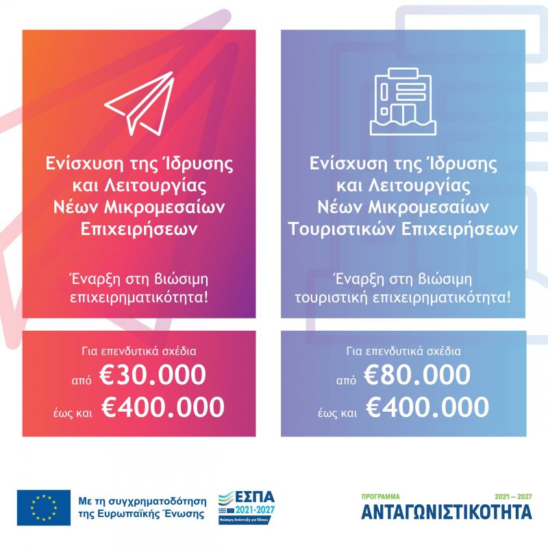 Ολοκλήρωση υποβολών αιτήσεων χρηματοδότησης για τις Δράσεις «Ενίσχυση της Ίδρυσης και Λειτουργίας Νέων Μικρομεσαίων Επιχειρήσεων» και «Ενίσχυση της Ίδρυσης και Λειτουργίας Νέων Μικρομεσαίων Τουριστικών Επιχειρήσεων»