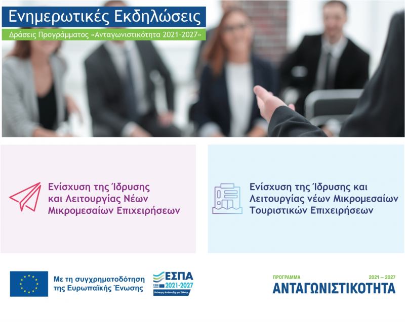 Διαδικτυακή εκδήλωση για τις Δράσεις «Ενίσχυση της Ίδρυσης και Λειτουργίας νέων Μικρομεσαίων Τουριστικών Επιχειρήσεων» & «Ενίσχυση της Ίδρυσης και Λειτουργίας νέων Μικρομεσαίων Επιχειρήσεων»