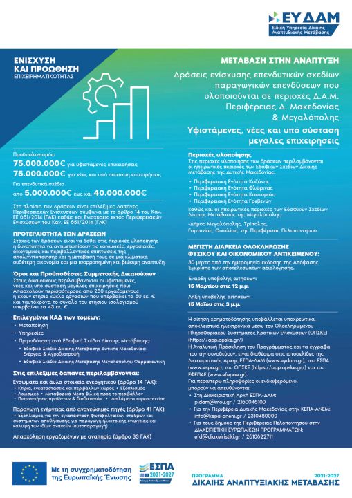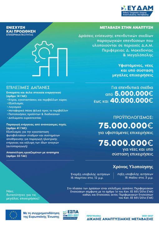 Υφιστάμενες μεγάλες επιχειρήσεις, που θα υλοποιήσουν επενδυτικό σχέδιο στις περιοχές των Εδαφικών Σχεδίων Δίκαιης Μετάβασης (Ε.Σ.ΔΙ.Μ.) Δυτικής Μακεδονίας και Μεγαλόπολης, το οποίο θα σχετίζεται με τουλάχιστον έναν από τους επιλέξιμους ΚΑΔ που περιλαμβάνονται στο ΠΑΡΑΡΤΗΜΑ II: «Επιλέξιμοι τομείς δραστηριότητας (ΚΑΔ)» της παρούσας πρόσκλησης.