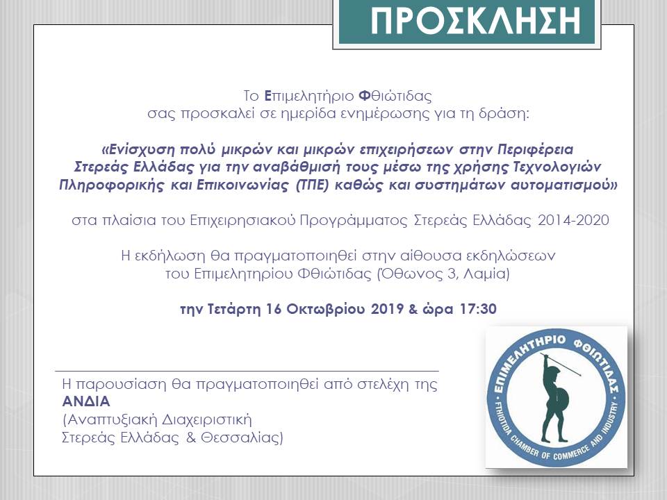 Στις 16/10/2019 πραγματοποιείται ημερίδα ενημέρωσης για τη δράση "Ενίσχυση των πολύ μικρών και μικρών επιχειρήσεων με την χρήση ΤΠΕ" του Ε.Π. Στερεάς Ελλάδας 2014 - 2020.